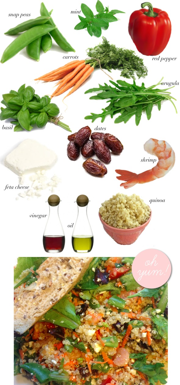 All you have to do is chop up the carrots, peas, red pepper, mint, basil and dates, cook the quinoa as per usual (one cup quinoa to two cups water), saute the shrimp in a bit of garlic and butter, let the quinoa and shrimp cool in the fridge, then toss everything together with the crumbled feta, drizzle some olive oil and balsamic and you're good to go! I added some toasted french bread and sliced avocado as well which made the dish absolutely perfect! Super easy and super healthy - enjoy!