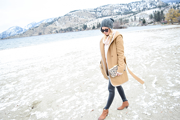 Coat: Aritzia (camel sold out, similar) | Sweater: Lulu*s | Leggings: Mimi Chica | Boots: Steve Madden (sold out similar 1, similar 2, similar 3) | Clutch: Jcrew (old, similar) | Sunnies: Maccs | Toque: Kohls | Lipstick: Mac