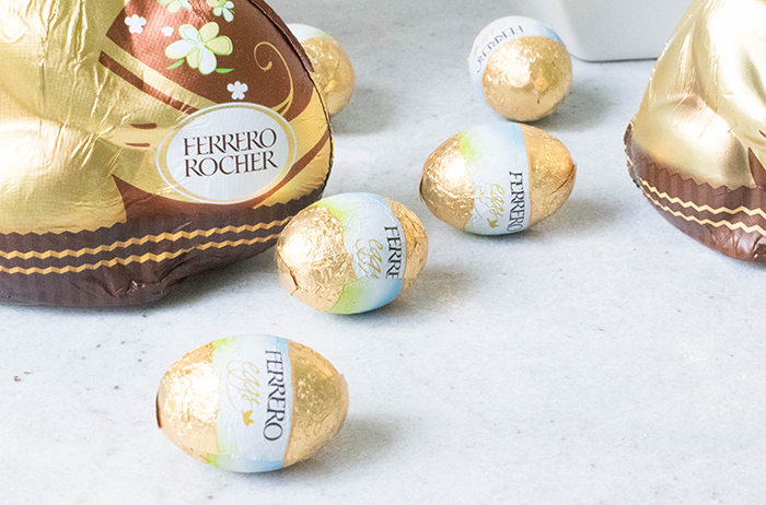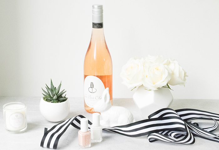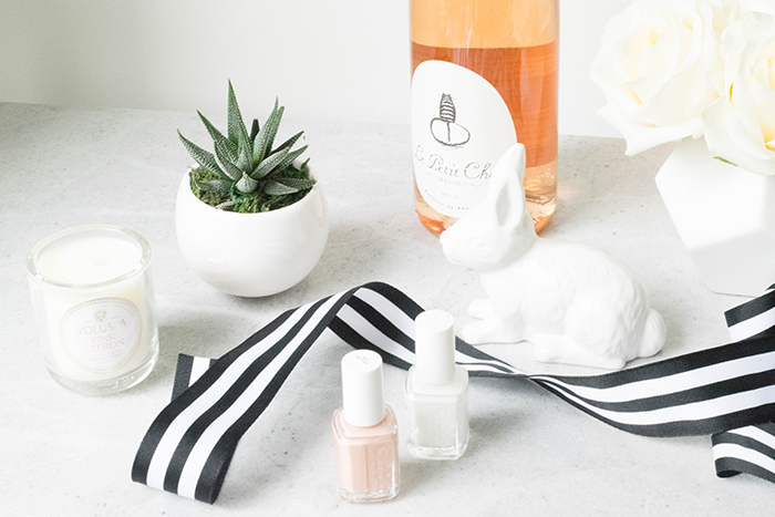 Chocolate: Ferrero Rocher | Basket: Michaels (similar) | Ribbon: Michaels (similar) | Candle: Voluspa | Bunny: Chapters | Succulent: Home Depot | Polish: Essie Blanc, Essie Perennial Chic | Wine: Everything Wine | Geometric vase: Lulu & Georgia
