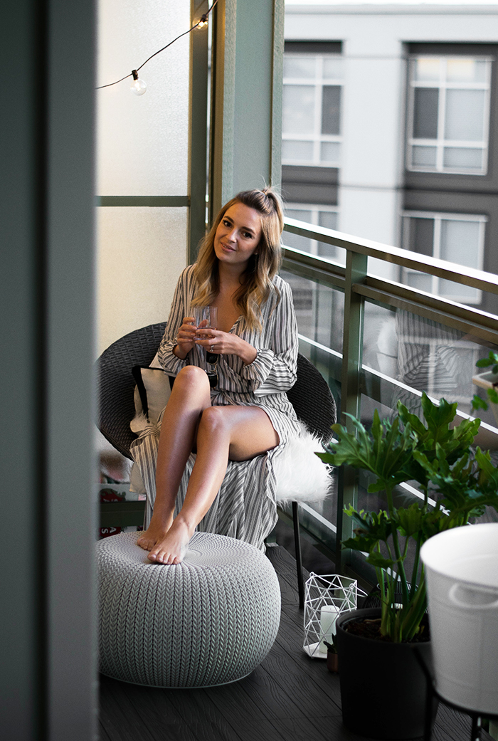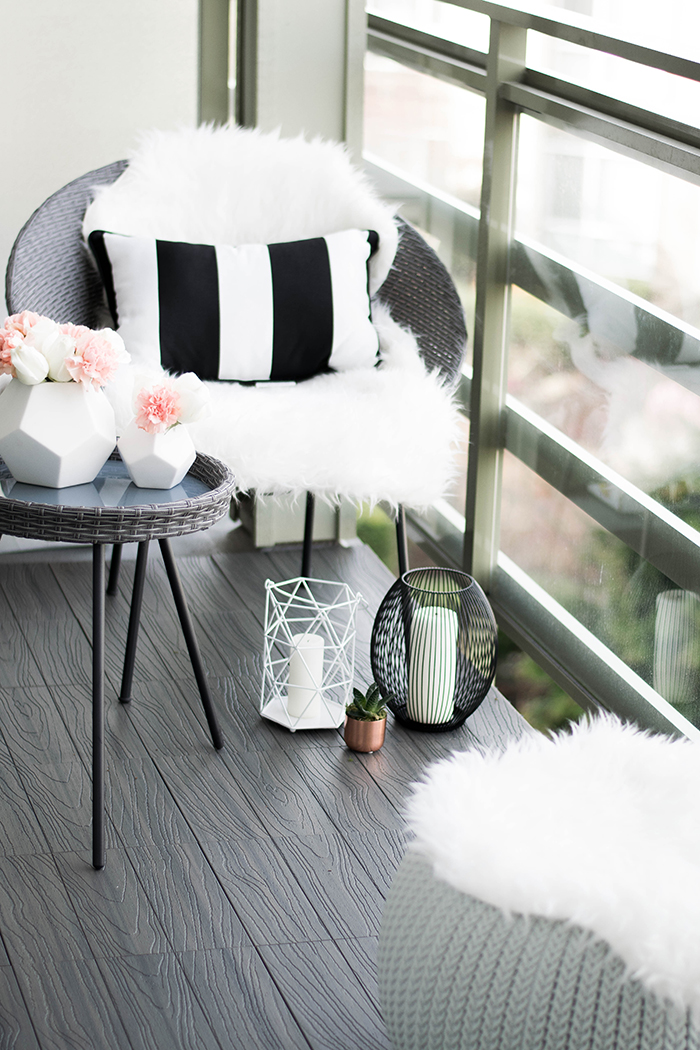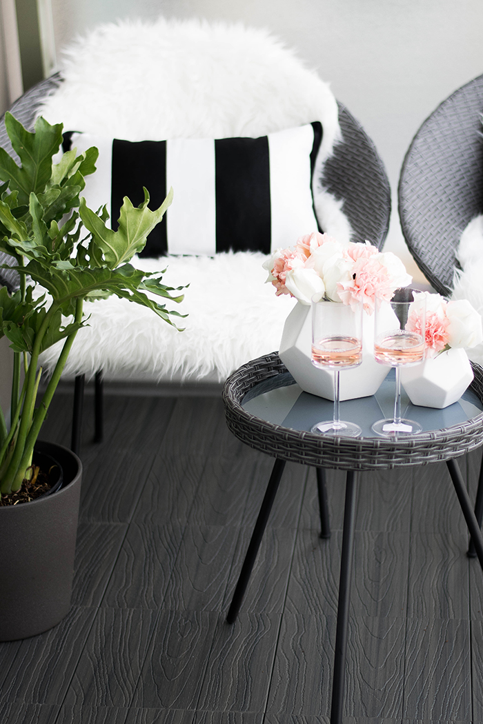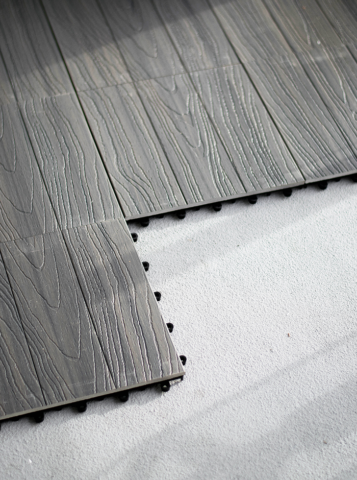 Okay, this was the easiest thing ever!! You really just put the pieces together like a puzzle and it makes your outdoor space look 1000x better!! Our balcony was a muted light grey with stains from the previous owners so we used the Veranda deck tiles from Home Depot for the most gorgeous dark grey look to completely transform our outdoor space.