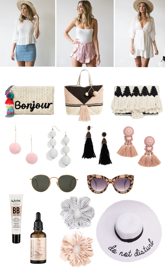 Heading on vacay is the perfect reason to refresh your poolside wardrobe and pick up some fun in the sun approved pieces. Mexico is gorgeous and filled with bright colors, turquoise waters, and all the festive fun, so I wanted to pick up some new pieces to spruce up my current warm weather wardrobe. Obviously I'll be packing all the new arrivals from MACCS the label (that's my clothing line for those that don't know!). I also picked up a couple fun handbags to take from the beach to nights out. I love the fun straw and pom pom details. Another must for sunny vacays are tassel or drop earrings - so cute with little off the shoulder tops and dresses. Every vacation I always bring my go-to round Ray bans, I also recently fell back in love with my Quay leopard sunnies so those will be coming along as well. Another vacation must is the NYX BB cream, I pick up a new bottle up almost every sunny vacation I head on because it's the perfect lightweight make-up option that makes me feel done-up yet light and fresh! No one needs layers of makeup melting off in the sun. I also recently picked up the Josie Maran argan oil and am in love! I love the light formula for warm weather - super hydrating and gives you a natural glow. Lastly, a couple cute scrunchies for the pool and a fun sun hat and I'm good to go!