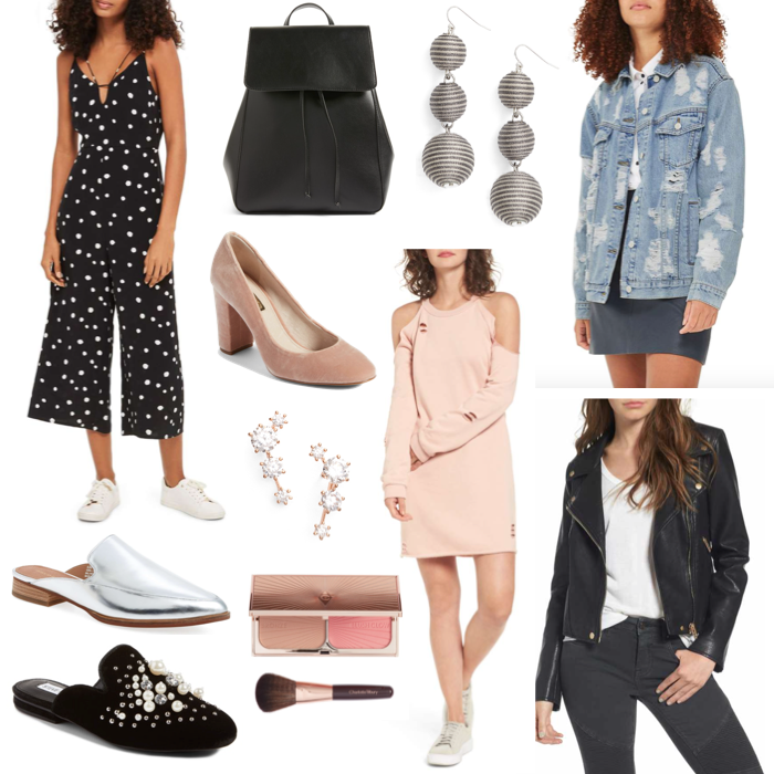 POLKA DOT JUMPSUIT | BACKPACK | DROP EARRINGS | DENIM JACKET | VELVET HEELS | SWEATER DRESS | EAR CRAWLERS | SILVER LOAFERS | PEARL LOAFERS | BLUSH PALETTE | MOTO JACKET